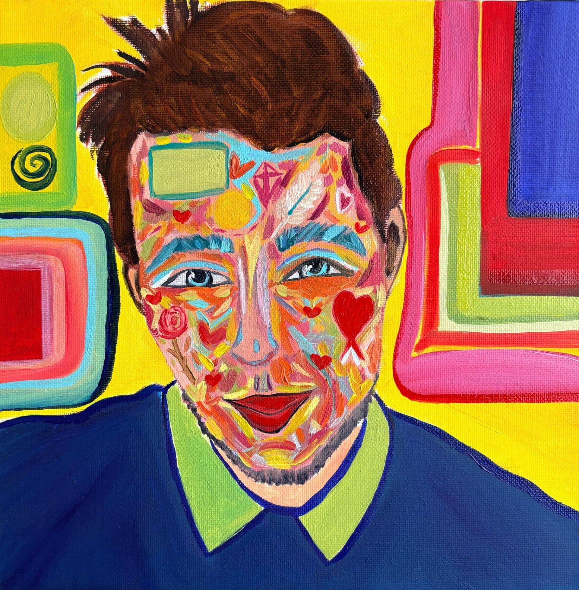 I've painted this portrait in my own distinctive style, focusing on capturing the person’s character through color. Every choice of shade and tone is carefully designed to reflect their personality and essence.